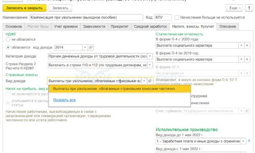 В статье также указано, что необлагаемый предел по взносам применяется к начислениям, у которых «Вид дохода» по взносам указан как «Выплаты при увольнении, облагаемые страховыми взносами частично». Такой вид дохода пока можно назначить только для одного вида начислений – с назначением «Выходное пособие»