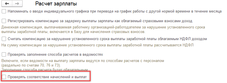 Нам в любом случае нужно отразить лишнюю выплату отпуска. Возможно у Вас включена проверка в настройках расчета зарплаты «Проверять соответствие начислений и выплат», поэтому программа выдает предупреждение. В этом случае проверку можно временно отключить и провести выплату.