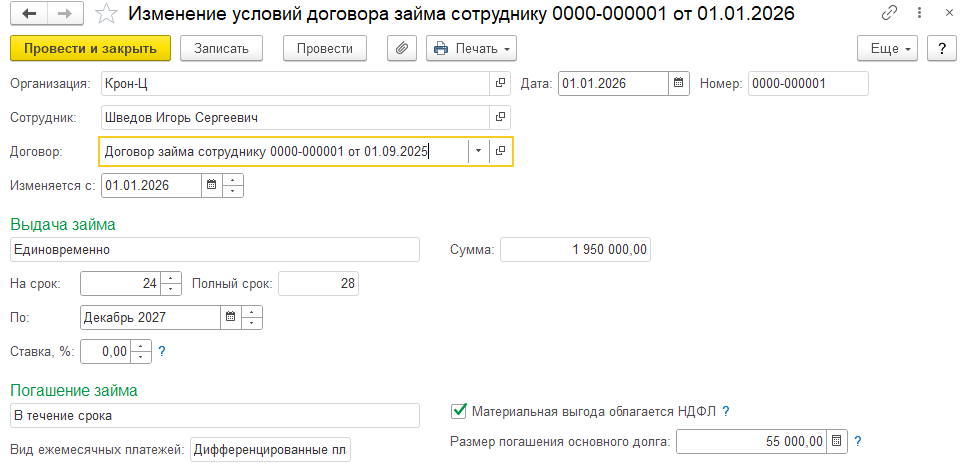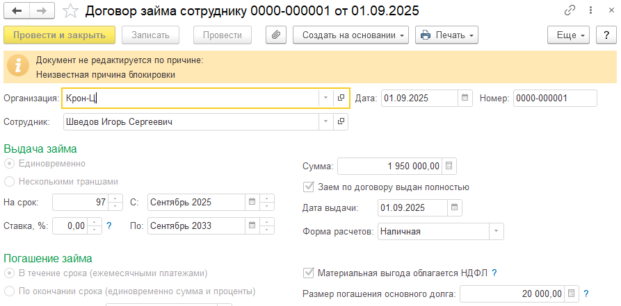 1. Создадим Договор погашения займа, в котором укажем полную сумму займа и ежемесячный платеж 20 000. Срок займа исходя из платежа 20000 получается больше, чем мы планируем. Позже исправим его через изменение договора займа.