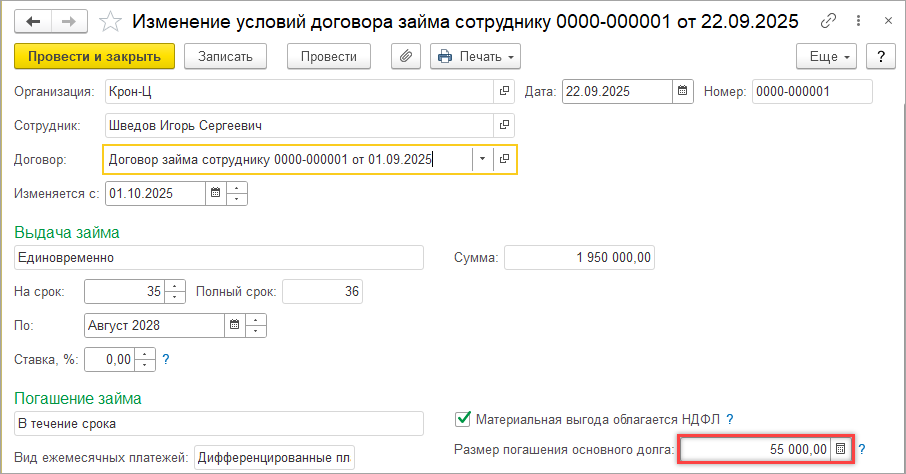 2. Со второго месяца создаем документ Изменение договора займа, в котором уменьшаем ежемесячный платеж ло 55000, срок кредита сокращается (далее еще будем вносить изменения):