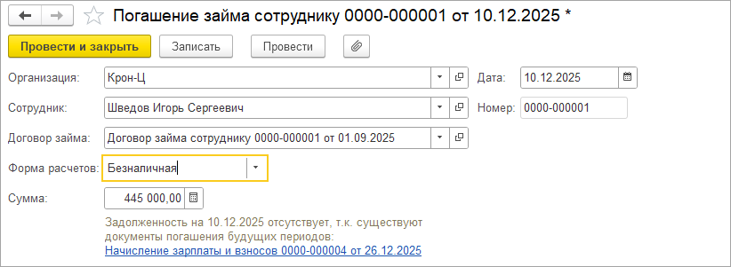 — Отражаем погашение на р/сч. документом Погашение займа сотруднику