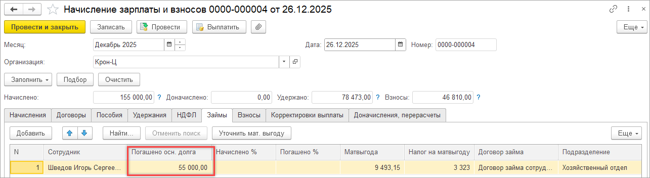 Выдаем беспроцентный займ сотруднику. Займ погашается путем удержания из ЗП.