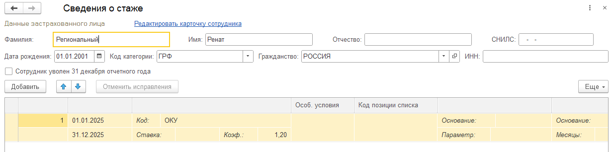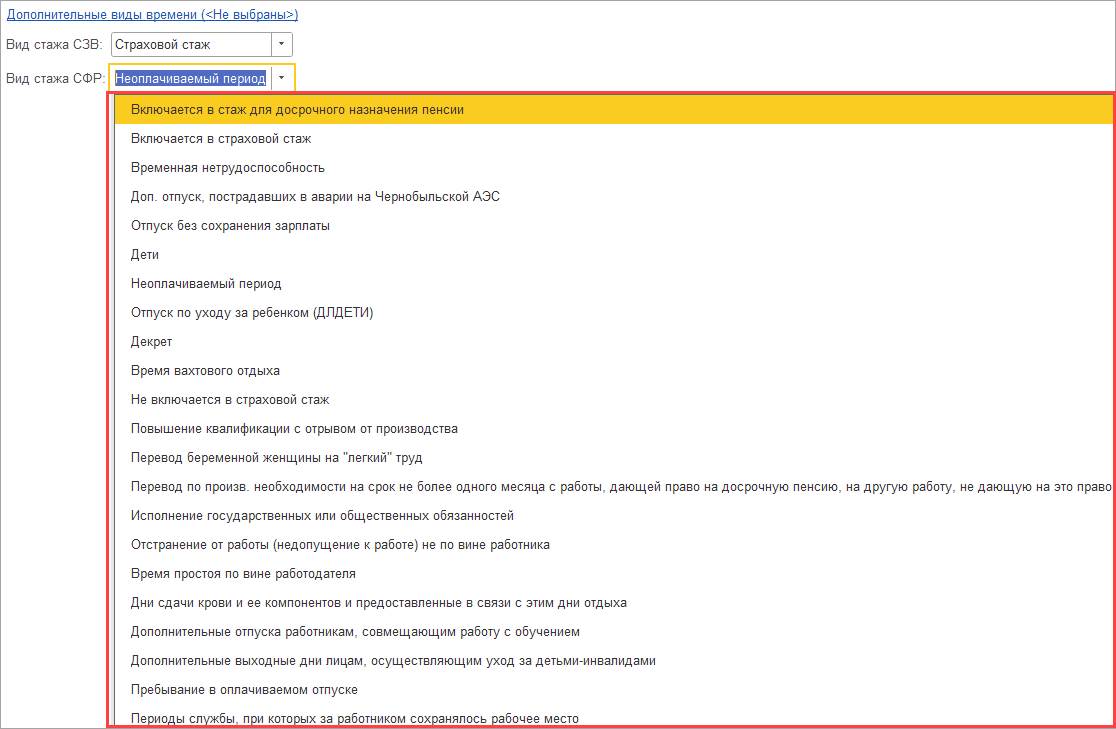 У нас виды стажа СФР заложены в программе и мы не можем добавить в него свой вид стажа, такой возможности в программе нет: