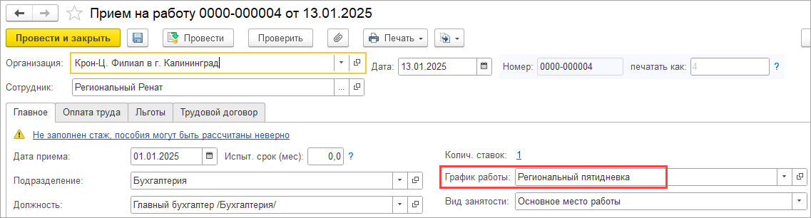 2. Принимаем сотрудника на работу по графику с региональным производственным календарем:
