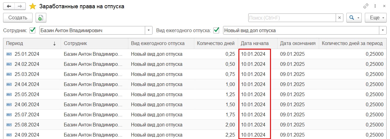 Я попробовала у себя на 3.1.34.77: Перенос данных создала сегодняшним числом и с месяцем Сентябрь 2025. Дату в поле период поставила — 10.01.2024. У меня начисление заработанного права на отпуск пошло с этой даты. И Дата начала в регистре у меня встала 10.01.24.
