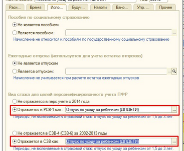 При указанных вами настройках для вида расчета «Пособие по уходу за ребенком до 3-х лет», даже если в РР «основные начисления» нет вида оплаты «отпуск по уходу за ребёнком без оплаты», то все равно в СЗВ-Стаж период заполняется корректно.