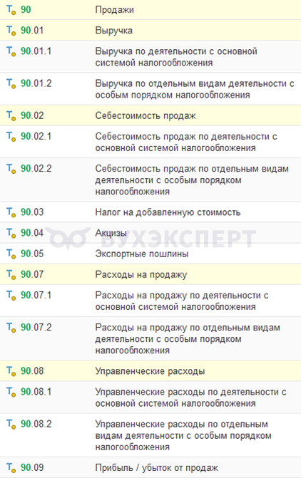 В Бухгалтерском учете для отражения прибыли от продаж используется счет 90 Продажи. В программе 1С к счету открыты следующие субсчета