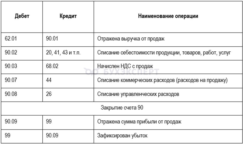 В таблице приведены основные бухгалтерские проводки, касающиеся формирования прибыли от продаж в бухгалтерском учете