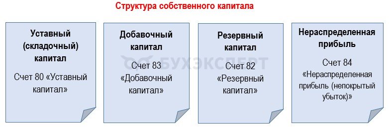 В Бухгалтерском учете собственный капитал принято подразделять на 4 основных элемента (Положение N 34н, утв. Приказом Минфина от 29.07.1998 N 34н).
