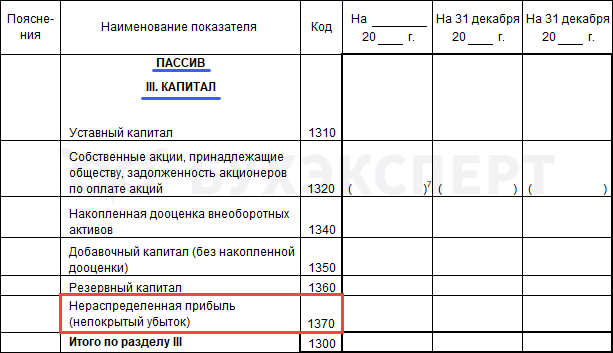 Строка 1370 «Нераспределенная прибыль (непокрытый убыток) бухгалтерского баланса находится в разделе III «Капитал» бухгалтерского баланса:
