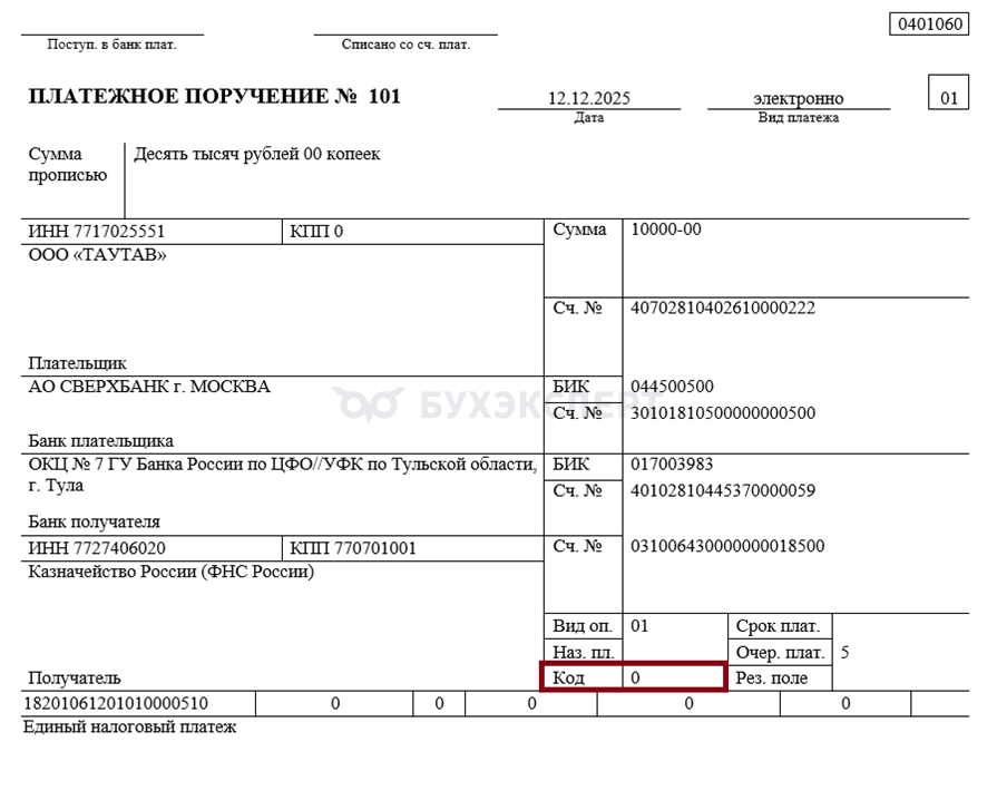 При перечислении единого налогового платежа (ЕНП) в поле 22 «Код» указывают «0», если уникальный идентификатор начисления не присвоен налоговым органом. Оставлять поле пустым нельзя (ФНС России)