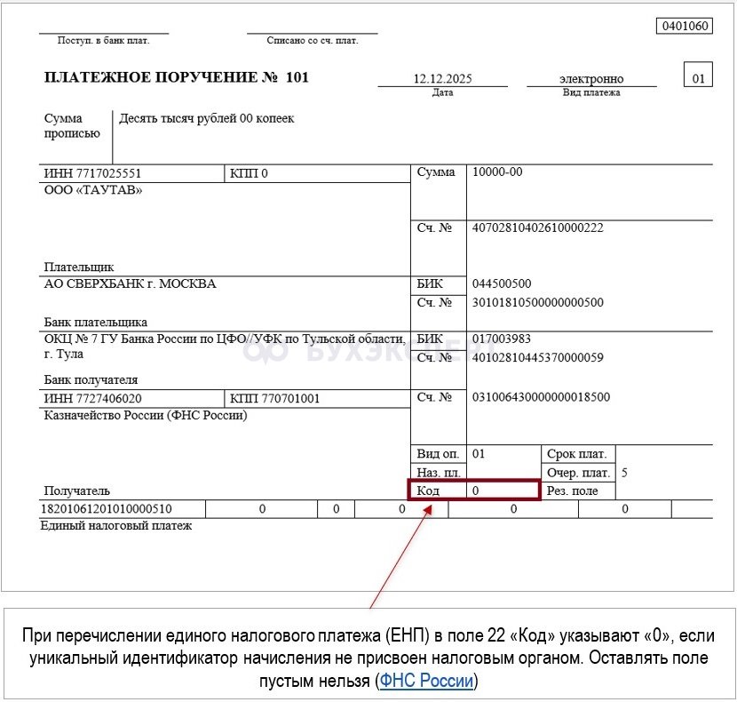 Компании и ИП в поле 22 платежного поручения проставляют «0» в случаях, когда самостоятельно формируют платежное поручение и уникальный идентификатор начисления (УИН) не был установлен получателем средств. Это правило применяется при уплате текущих налогов и взносов, когда заранее присвоенный уникальный идентификатор начисления (УИН) отсутствует.