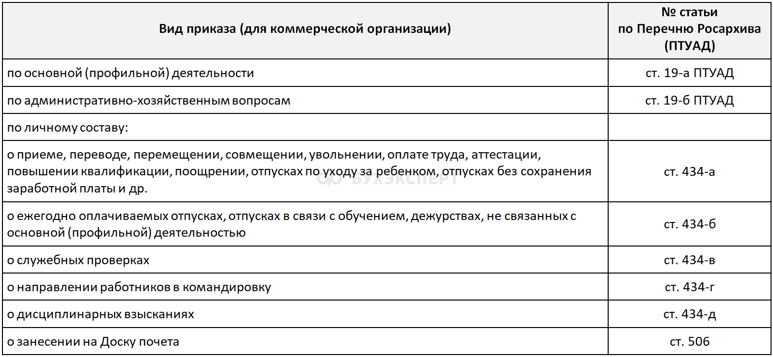 Единственным нормативным актом, содержащим группировку приказов по категориям, является приказ Росархива от 20.12.2019 N 236 «Об утверждении Перечня типовых управленческих архивных документов…» (далее — ПТУАД), действие которого распространяется как на государственный, так и на коммерческий сектор экономики. В соответствии с ПТУАД приказы коммерческой организации классифицируются следующим образом (извлечение).