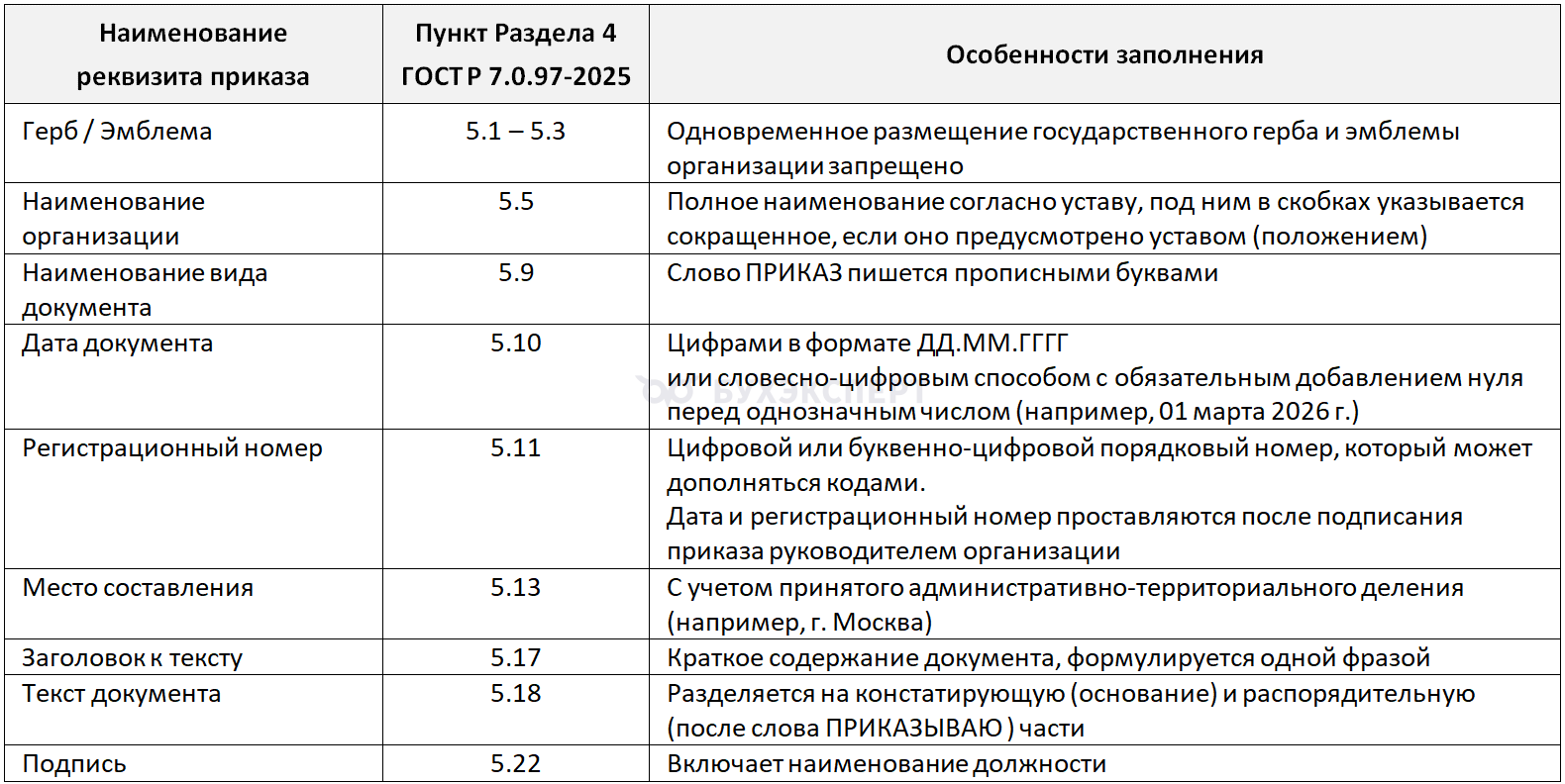 Список реквизитов приказа приведен в Разделе 4 ГОСТ Р 7.0.97-2025.