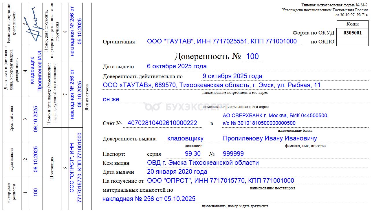 | Номер доверенности | Цифровой идентификатор, отличный от нуля | Присваивается бухгалтерией либо в Книжке доверенностей (для формы № М — 2), либо в Журнале учета выданных доверенностей, где нумерация ведется по дате выдачи (для формы № М — 2а).