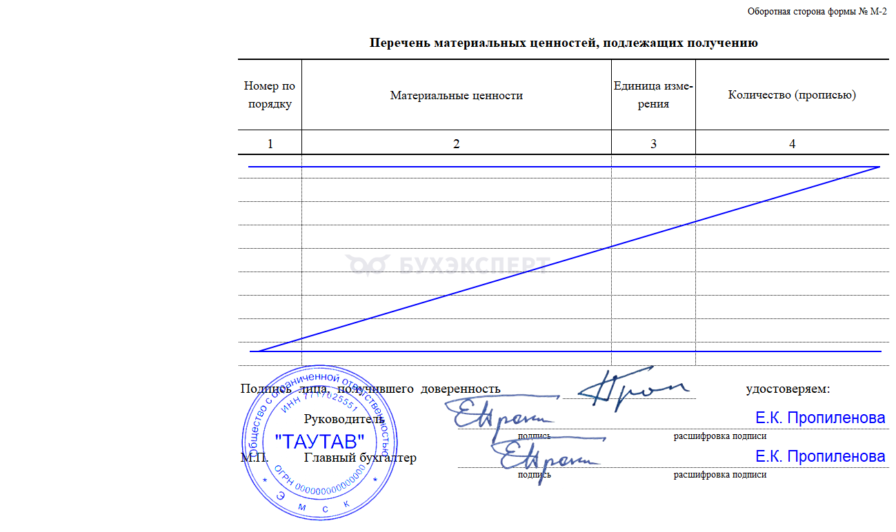 | Руководитель | Подпись с расшифровкой ФИО | На обратной части бланка формы № М — 2 проставляются подписи ответственных лиц доверителя и их ФИО полностью |