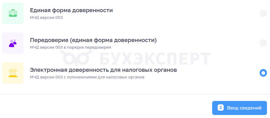 | Выбираем тип доверенности | Предлагается: создать единую универсальную доверенность, МЧД на передоверие или электронную доверенность для ИФНС. Выбираем последний вариант |