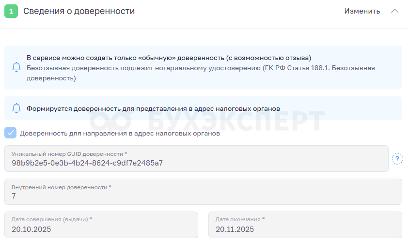 Проставляем дату выдачи МЧД, ее внутренний номер по организации, устанавливаем срок. Уникальный электронный номер GUID присваивается МЧД автоматически |