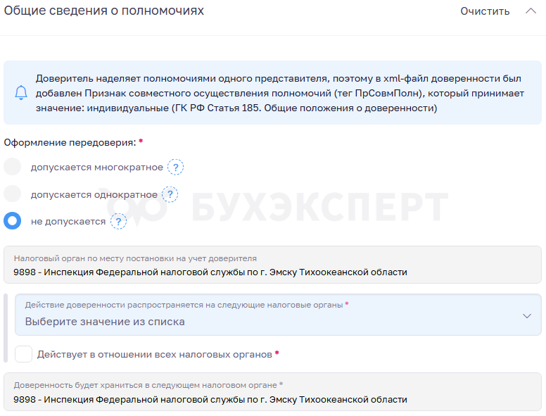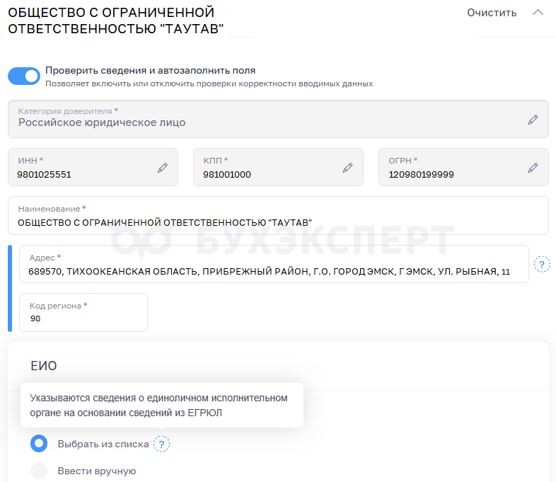 Заполняем сведения об организации-доверителе, при этом часть данных можно подтянуть из ЕГРЮЛ |