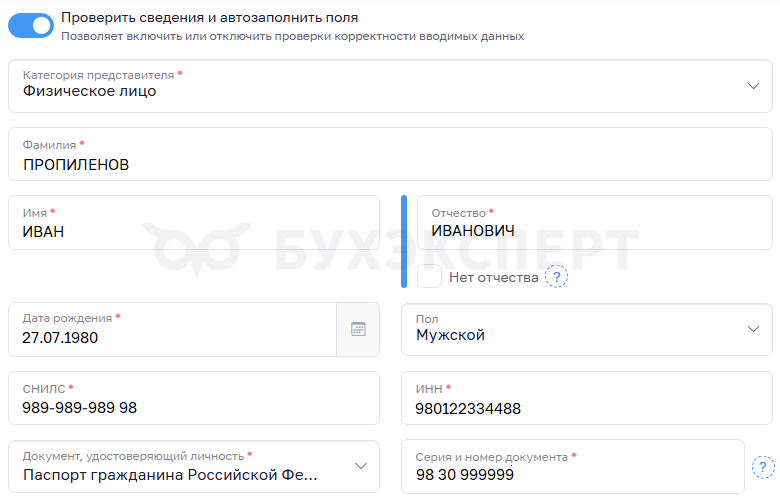 - сведения о представителе — ФИО, паспортные данные, ИНН, СНИЛС и другие