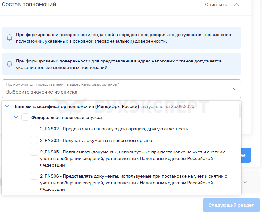 | Выбираем полномочия и возможности передоверия | Передаем представителю необходимые полномочия, выбирая их из классификатора: |