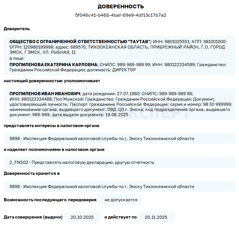Сформируем образец электронной машиночитаемой доверенности и дадим рекомендации по правильному ее заполнению с учетом текущего правового регулирования. В качестве исходных данных примем, что ООО «ТАУТАВ» решило выдать своему бухгалтеру доверенность для сдачи отчетности в налоговую.