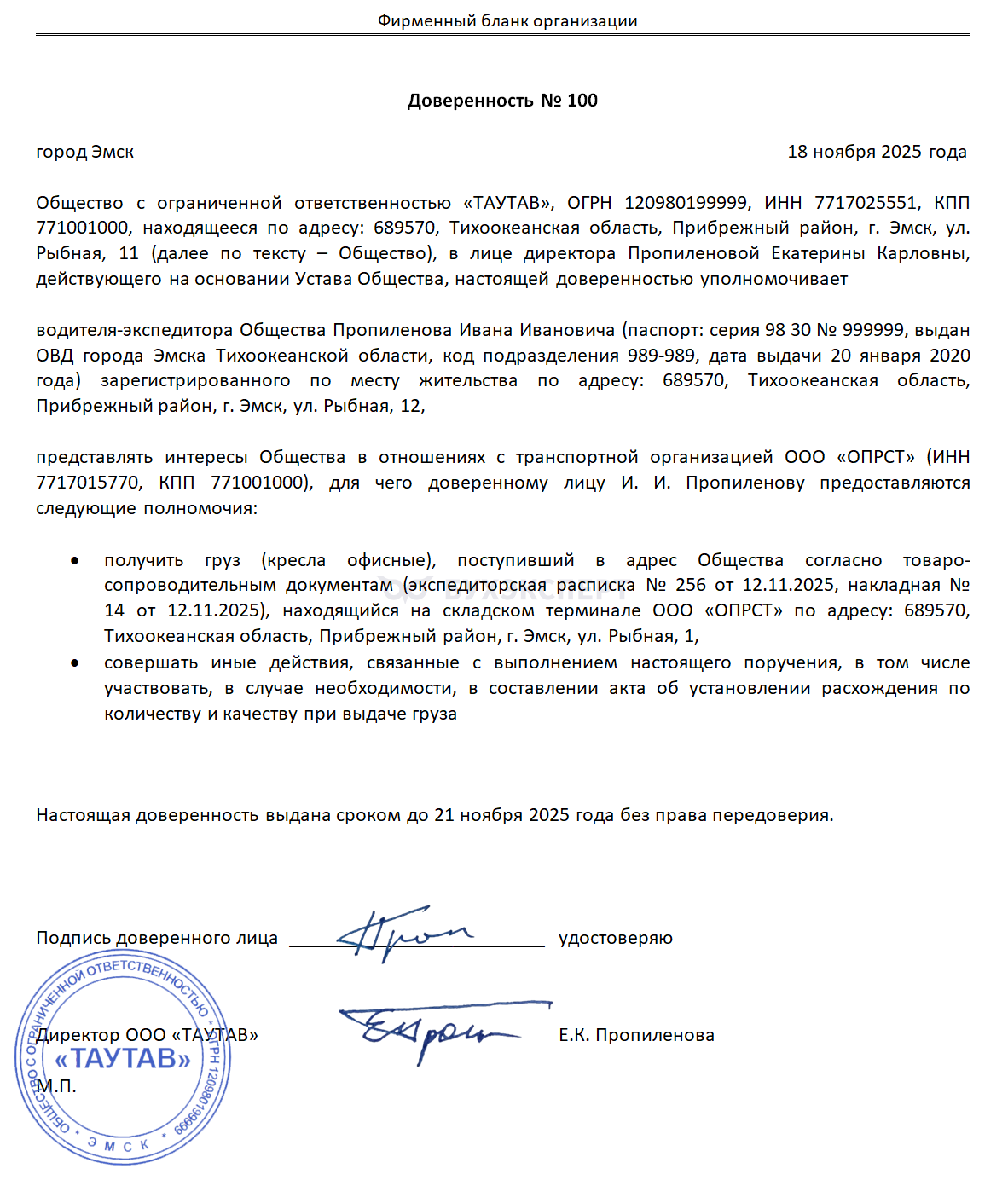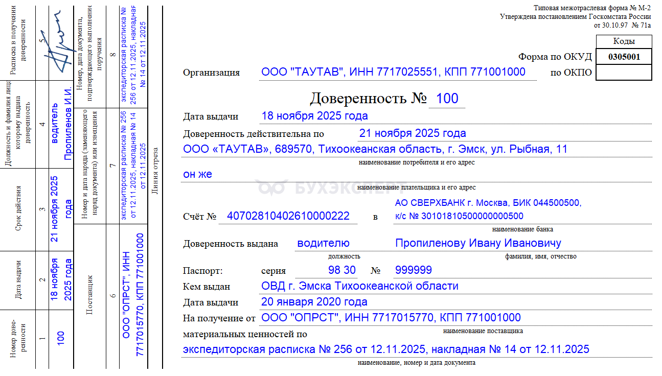 ООО «ТАУТАВ» оформило доверенность на получение груза своему работнику (водителю-экспедитору). Перевозчиком, производящим сдачу груза, выступает транспортная компания ООО «ОПРСТ» (все сведения, указанные в доверенности – вымышленные):