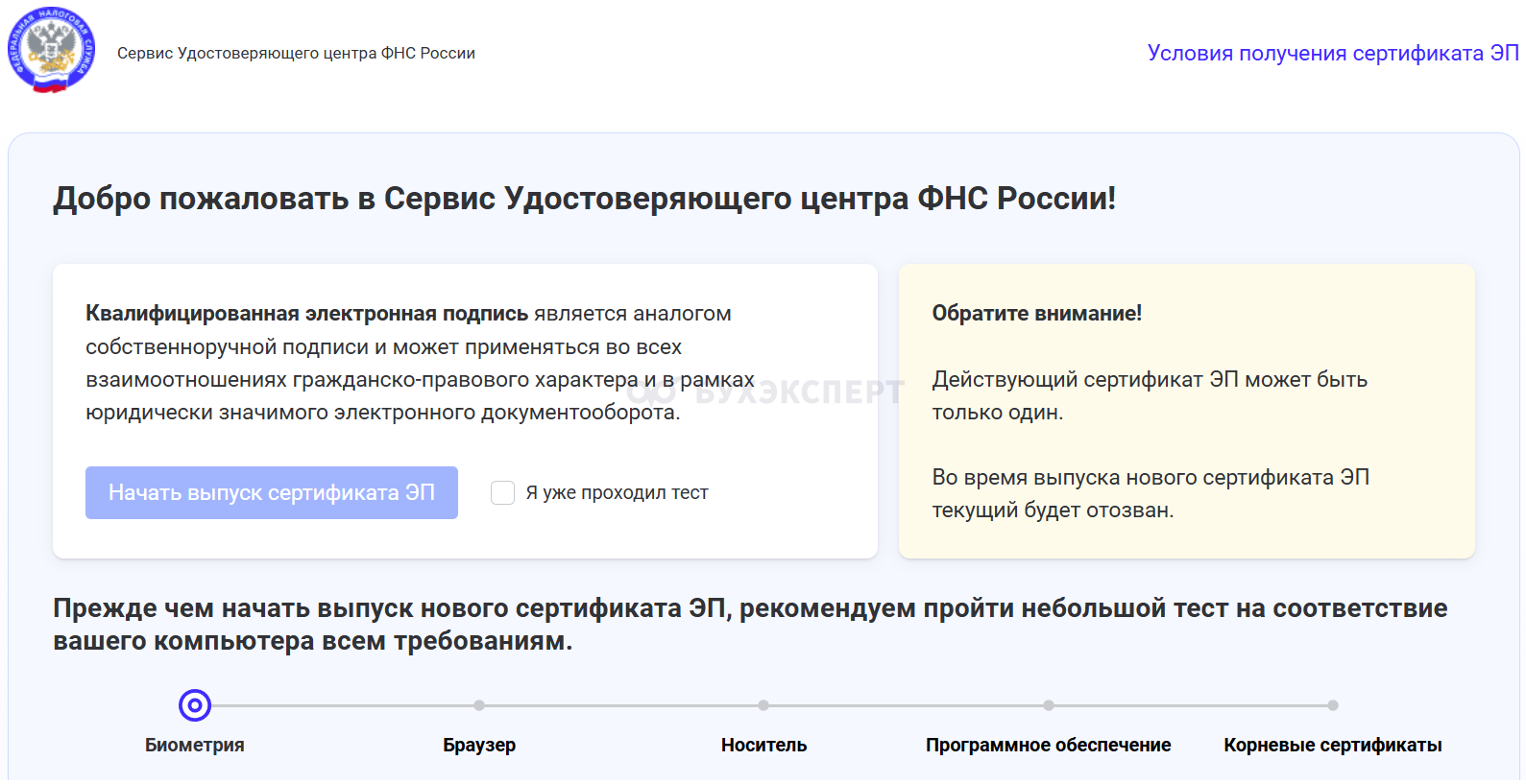- локальный ПК с актуальными программами-криптопровайдерами, настроенными для работы с квалифицированной ЭЦП (их состояние можно проверить с помощью «Сервиса выпуска сертификатов КЭП» УЦ ФНС)