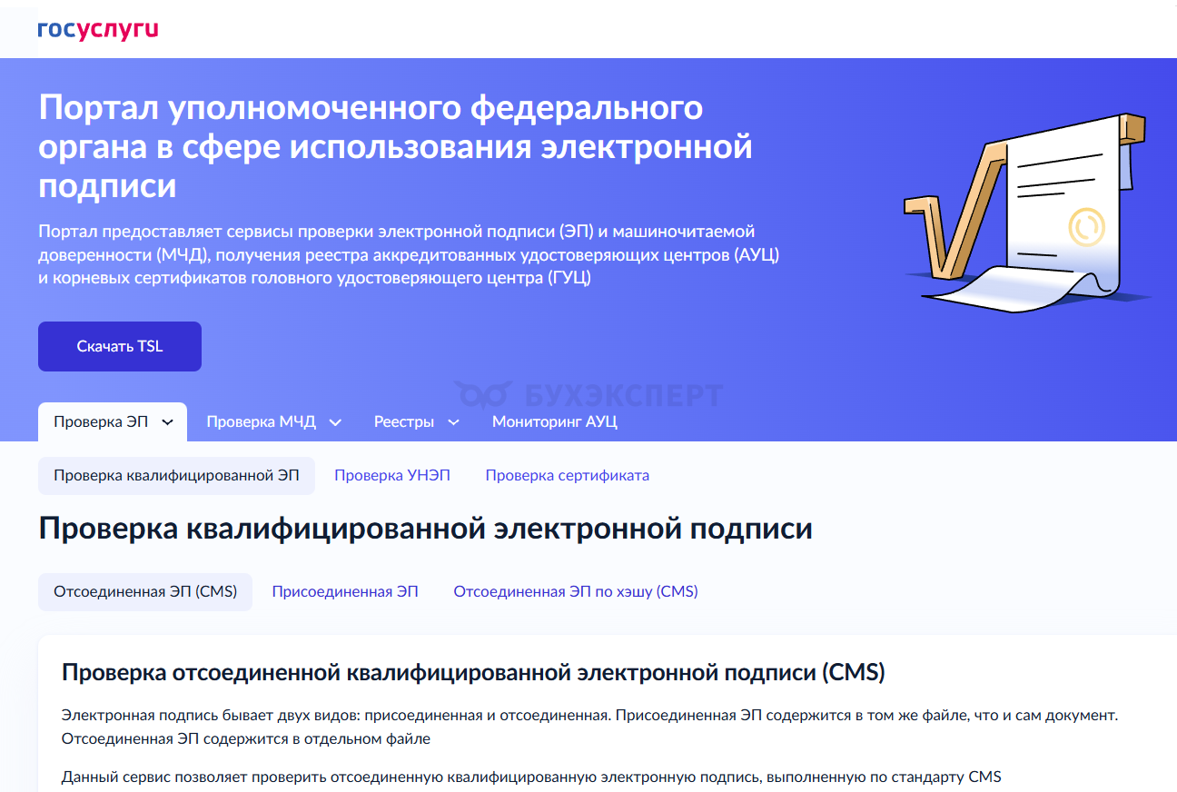 Шаг 1. проверка статуса текущего сертификата; как правило УЦ позволяет проверить подпись на своем сайте, но есть и иные возможности, например — на портале «Госуслуги».