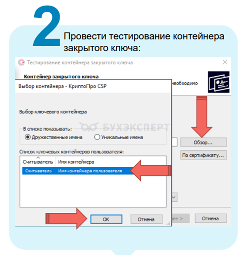 - В окне нажать кнопку «Обзор», выбрать контейнер пользователя и нажать кнопку «ОК»