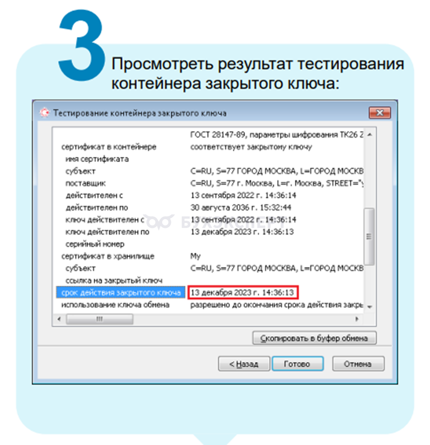 - В результате будет представлена полная информация о протестированном контейнере ключа, в т.ч. и его срок действия