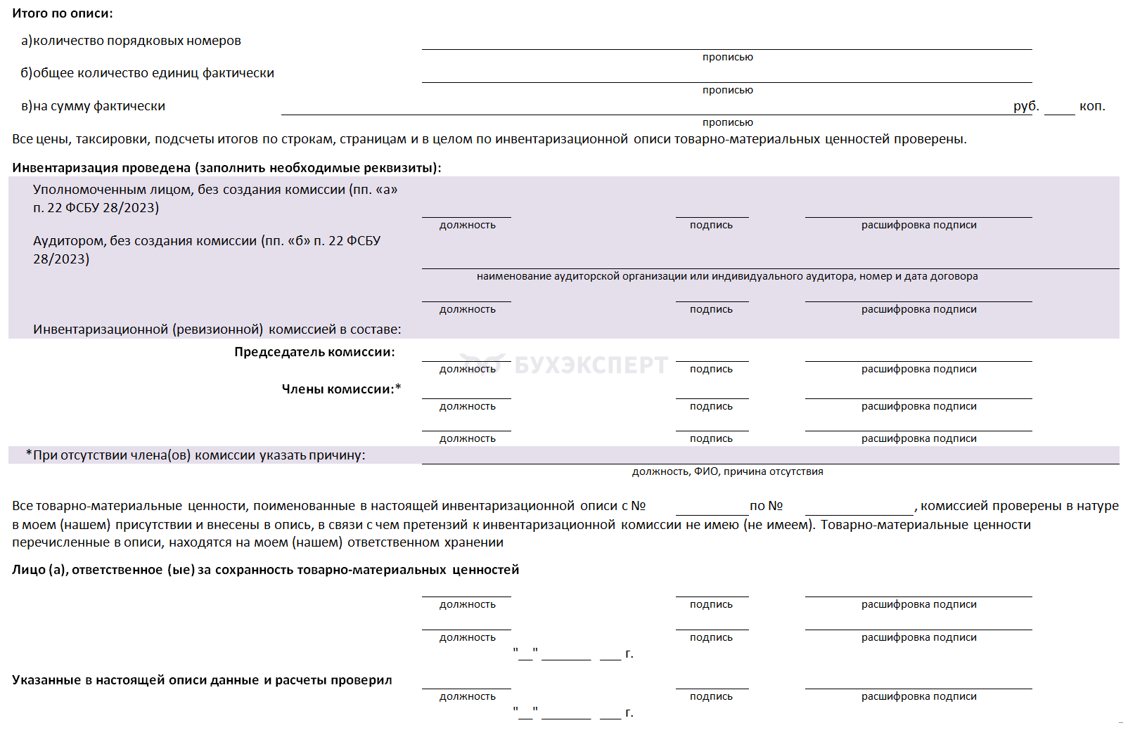 На последней странице фиксируются итоги проверки. Здесь свои подписи ставят все члены комиссии, а также материально ответственные лица, давшие расписку в начале описи. При отсутствии комиссии, заполняются только те реквизиты, которые соответствуют сложившейся ситуации (пп. «а» и «б» п. 22 ФСБУ 28/2023).