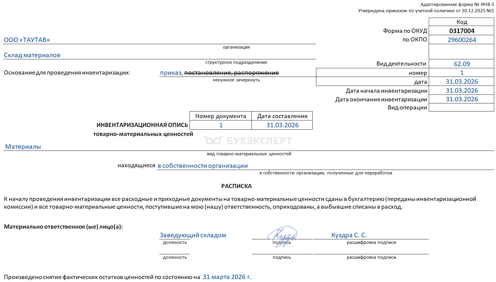 Нижняя часть страницы отводится под расписку материально ответственных лиц. До начала проверки они обязаны подтвердить подписью, что все документы переданы в бухгалтерию или комиссии, а поступившие ценности оприходованы (п. 26 и 27 ФСБУ 28/2023).