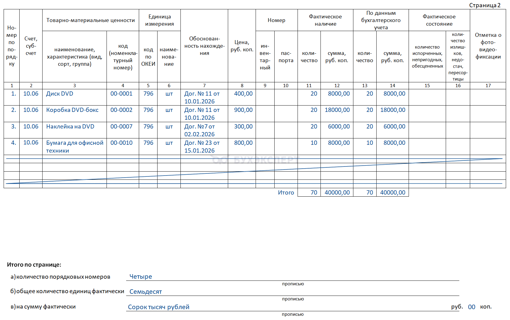 б) количество (прописью) порядковых номеров активов и общее количество (прописью) таких активов в натуральных единицах измерения, записанных на каждой странице, вне зависимости от того, в каких единицах измерения (в том числе штуках, килограммах, метрах) эти активы показаны (на каждой странице документа)