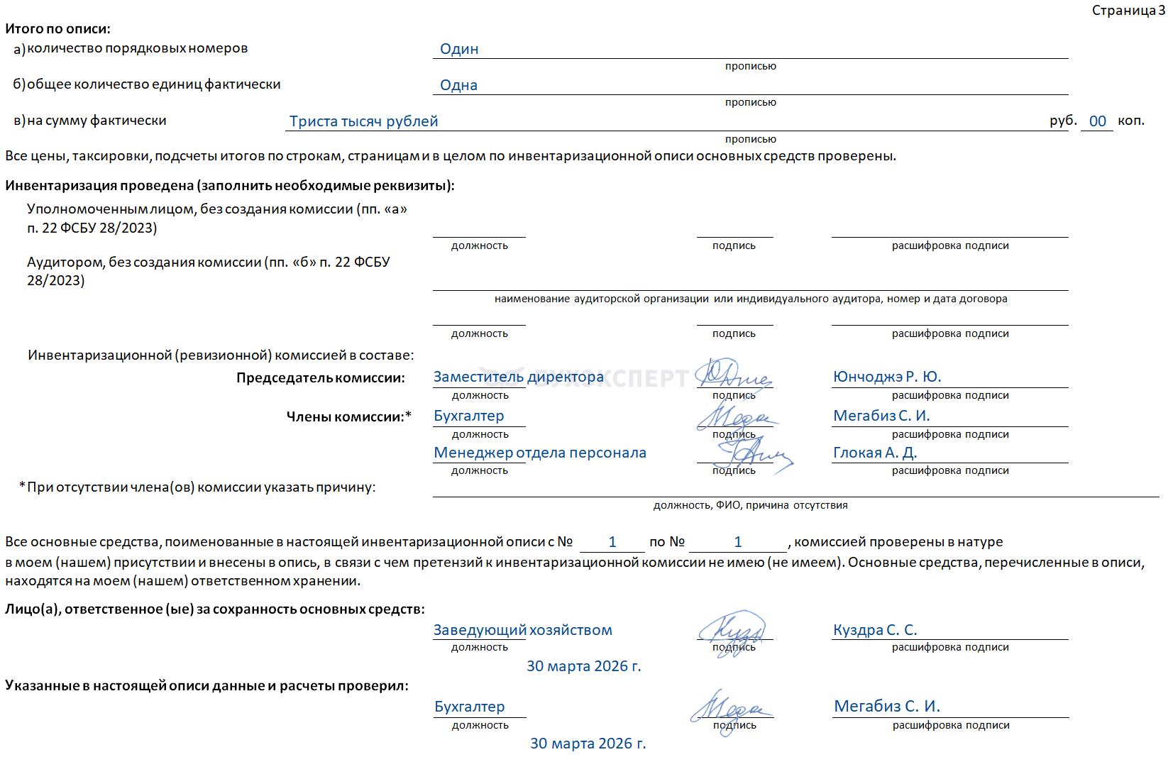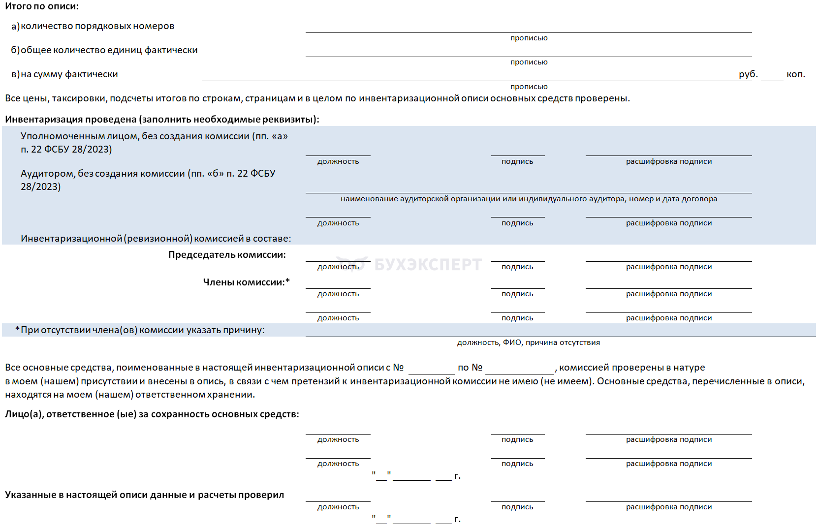 На последней странице описи подводятся итоги проверки. Документ подписывают все члены комиссии и материально ответственные лица. Если комиссия не создавалась, заполняются только реквизиты, применимые к фактическим условиям проведения инвентаризации (пп. «а», «б» п. 22 ФСБУ 28/2023).