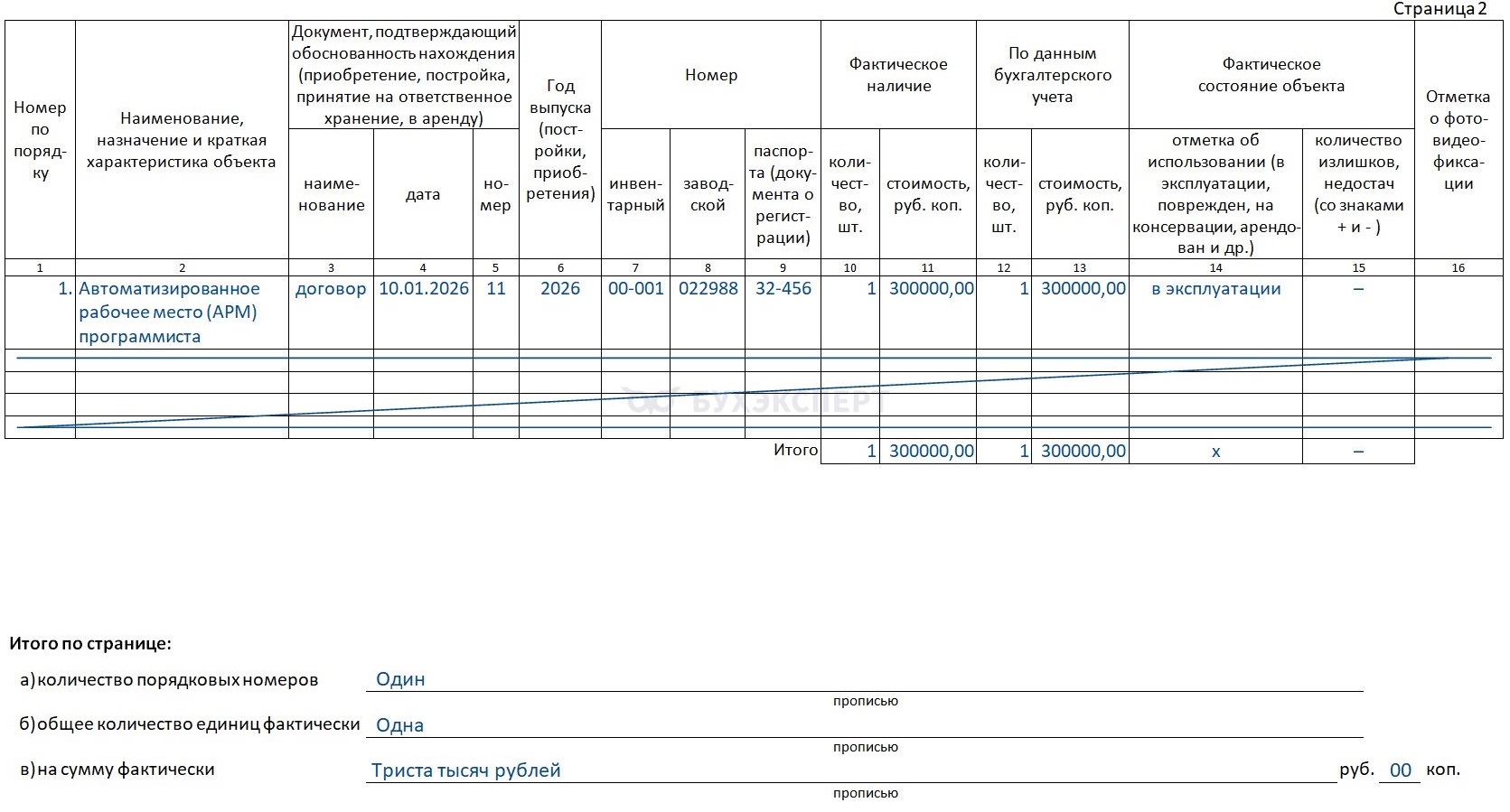 При заполнении таблицы, в графе 16 отметка о фото- и видеофиксации (при ее проведении) может проставляться словом «проведена». Обоснованность нахождения ОС у организации (графы 3-5) может подтверждаться записями: [договор] [дата] [номер]. Заполнение граф 14 и 15 служит основанием для дальнейшей квалификации объектов (например, для признания обесценения ОС или взыскания возмещения при недостаче).