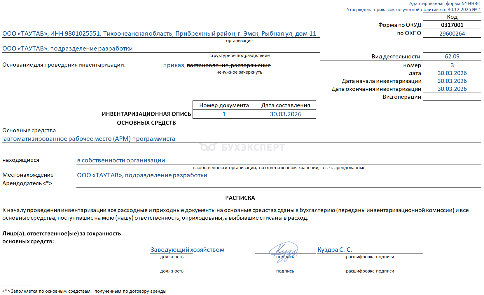 Инвентаризационная опись основных средств формы № ИНВ-1 — это типовая форма, утв. Постановлением Госкомстата от 18.08.1998 N 88, и предназначенная для проверки наличия зданий, транспорта, вычислительной техники и другого оборудования, относимого к объектам основных средств (далее — ОС). Несмотря на то, что с 2013 года унифицированные бланки не обязательны к применению, форма № ИНВ-1 по-прежнему широко применяется благодаря своей распространенности и интеграции в учетные системы.