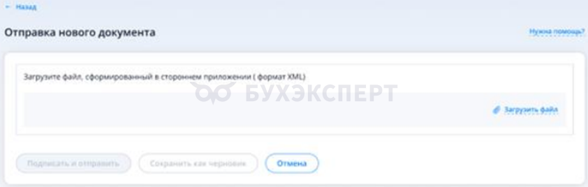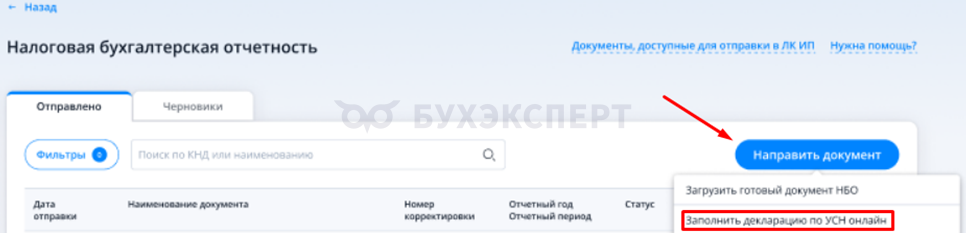 Для этого на странице Налоговая бухгалтерская отчетность перейдите по ссылке Документы, доступные к отправке в Личный кабинет ИП, нажмите Направить документ, выберите Загрузить готовый документ налоговой бухгалтерской отчётности (НБО) и кнопку Отправить документ.