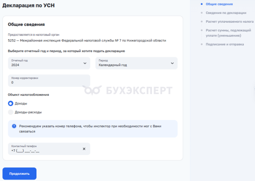 - Заполните основные сведения по декларации — Отчетный год, Период, Номер корректировки, Объект налогообложения, Контактный телефон.