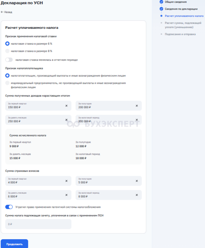 Если у вас объект «доходы», заполните поля — Признак применения налоговой ставки, Признак налогоплательщика, Сумма полученных доходов нарастающим итогом, Сумма страховых взносов — переключатель Утратил право применения патентной системы налогообложения — при необходимости. Сумма исчисленного налога рассчитывается автоматически.