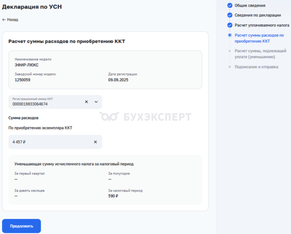 Если объект «доходы минус расходы» заполните поля — Признак применения налоговой ставки, Сумма полученных доходов нарастающим итогом, Сумма произведенных расходов нарастающим итогом, Сумма убытка (полученного в предыдущем налоговом периоде), уменьшающая налоговую базу за налоговый период. - Заполните данные по приобретению ККТ.