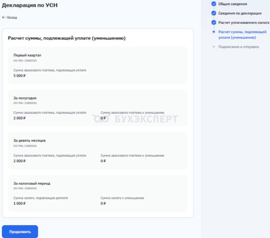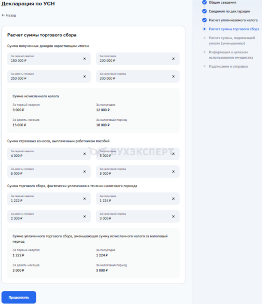 - Перейдите к заполнению данных в зависимости от выбранного объекта налогообложения.