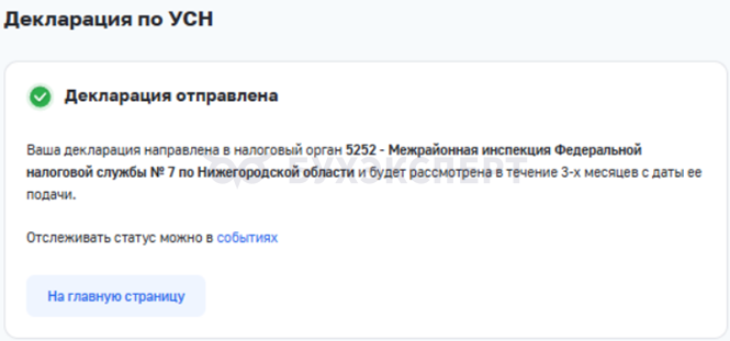 Сформированную декларацию можно скачать в формате PDF и проверить перед отправкой. Подпишите электронной подписью, отправьте декларацию в ИФНС.Дождитесь уведомления о приеме. Перейти на страницу просмотра информации о статусе отчета можно, нажав ссылку События в верхней части любой страницы.