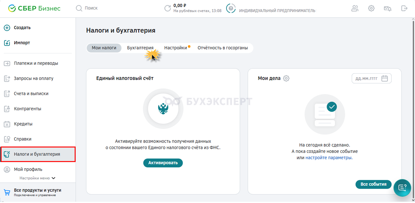 Шаг 1. В личном кабинете в меню слева «Налоги и бухгалтерия» перейдите в подраздел «Бухгалтерия».