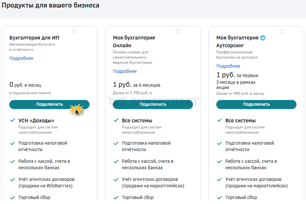 Шаг 2. Из списка предлагаемых вариантов продуктов выберите «Бухгалтерия для ИП» и нажмите «Подключить».