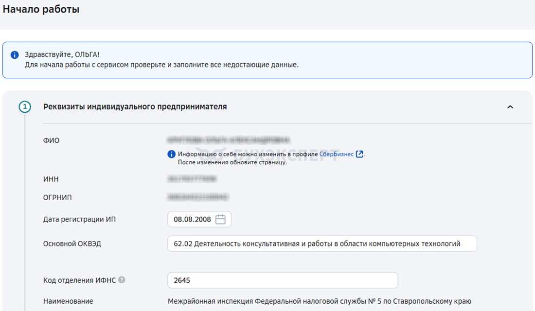 На следующих шагах необходимо подтвердить согласие с условиями предоставления сервиса, проверить контактные данные и для начала работы определить данные по ИП для ведения учета.