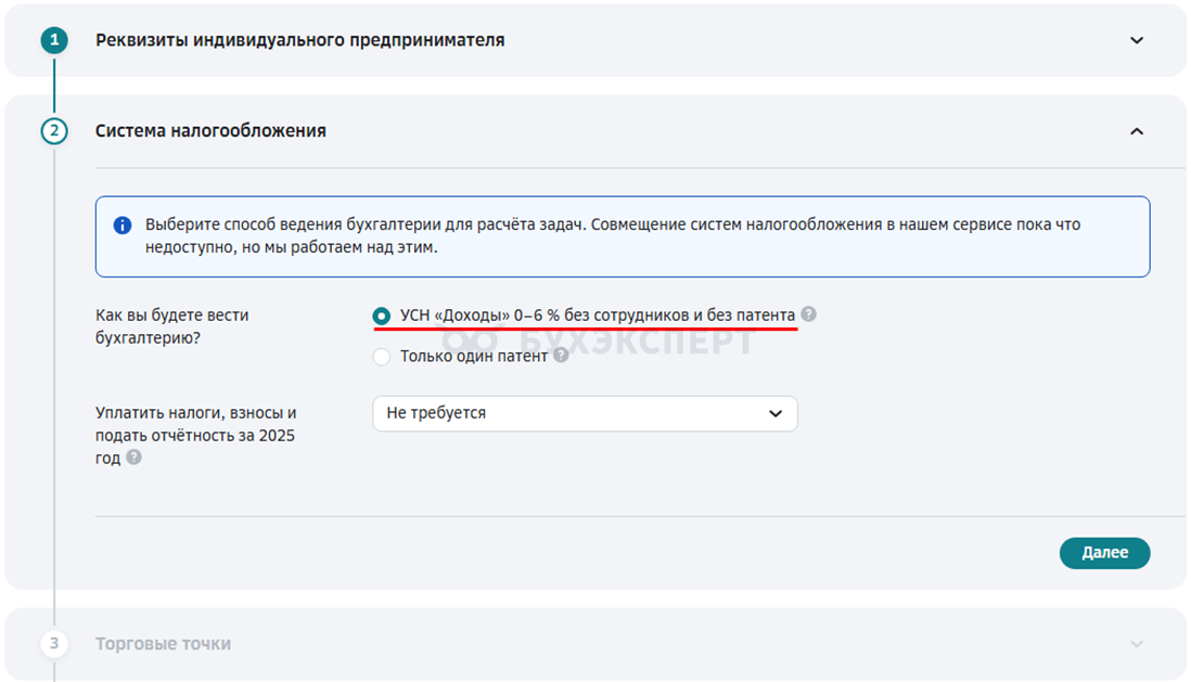 Шаг 4. Определите систему налогообложения, установив переключатель в нужное положение, отметив нужно ли уплачивать налоги и взносы за предшествующий отчетный период.