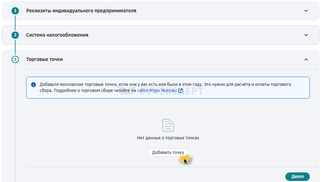 Шаг 5. При наличии торговых точек внесите данные о них – кнопка «Добавить точку» и перейдите к следующему шагу — «Далее».