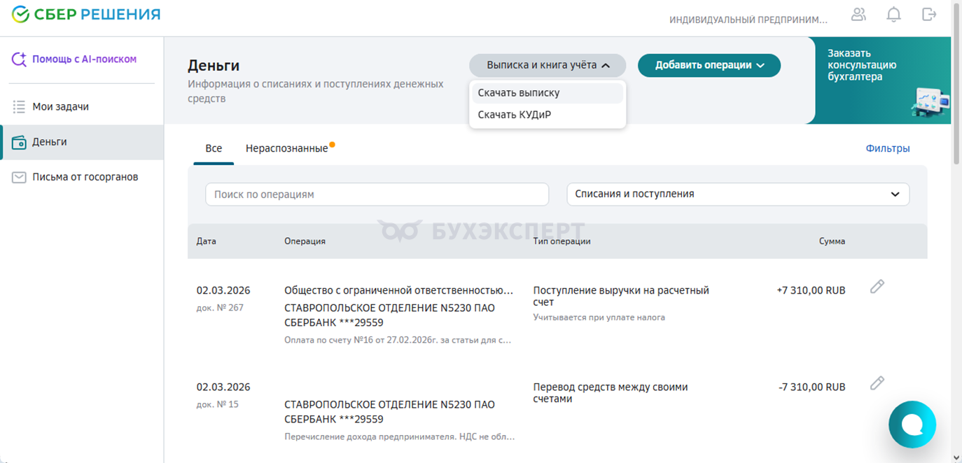 Рассмотрим пример подключения бухгалтерии для ИП от Сбербанка.
