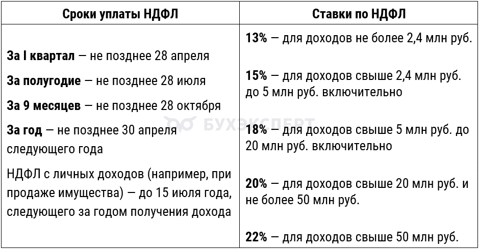 Сроки уплаты НДФЛ и ставки налога указаны в таблице: